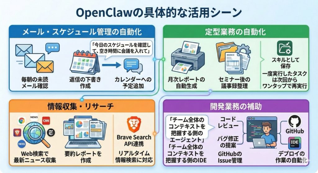 OpenClawを導入することで、これまで人間が時間を割いていた「作業」を大幅に削減できます。